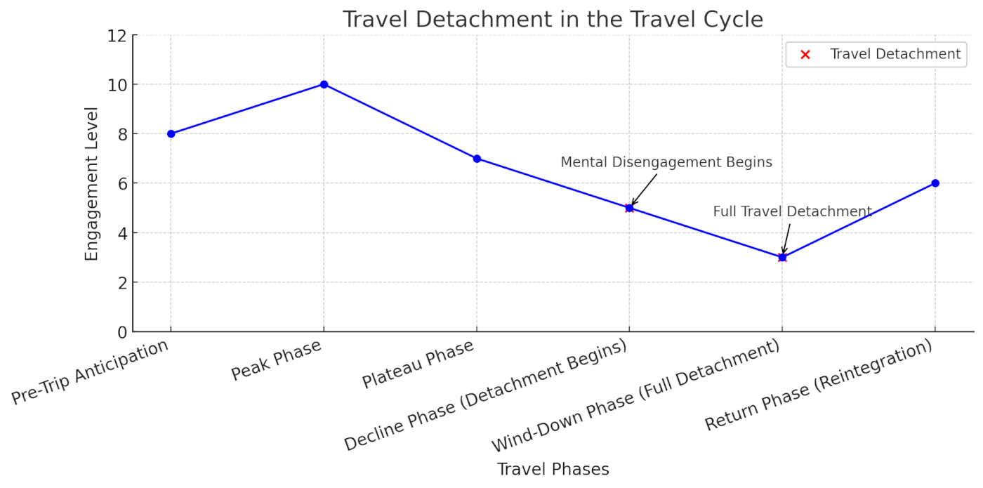 The emotional arc of a trip follows a predictable flow, with engagement levels rising, plateauing, and eventually declining. The graph below illustrates where travel detachment fits within this cycle, highlighting its place in the decline and wind-down phases.