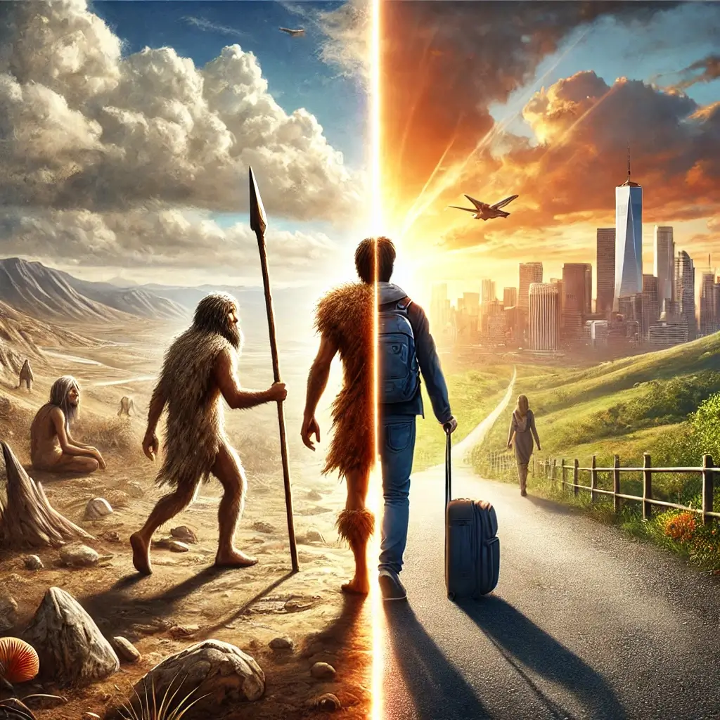 A composite digital painting of a prehistoric caveman walking through a natural landscape, blending into a modern traveler walking along an urban path with a city skyline